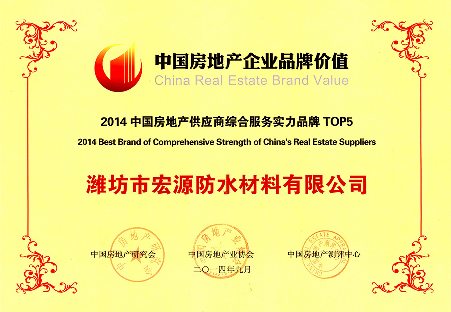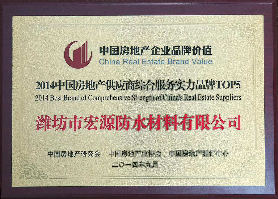 5强榜单。宏源防水于2014中国房地产供应商综合服务实力品牌TOP5榜上有名